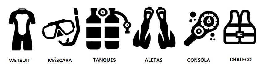 Durante este curso aprenderás a usar el equipo básico de buceo, que incluye: máscara, chaleco BCD, wetsuit o traje de neopreno, aletas, consola y tanque de oxígeno.